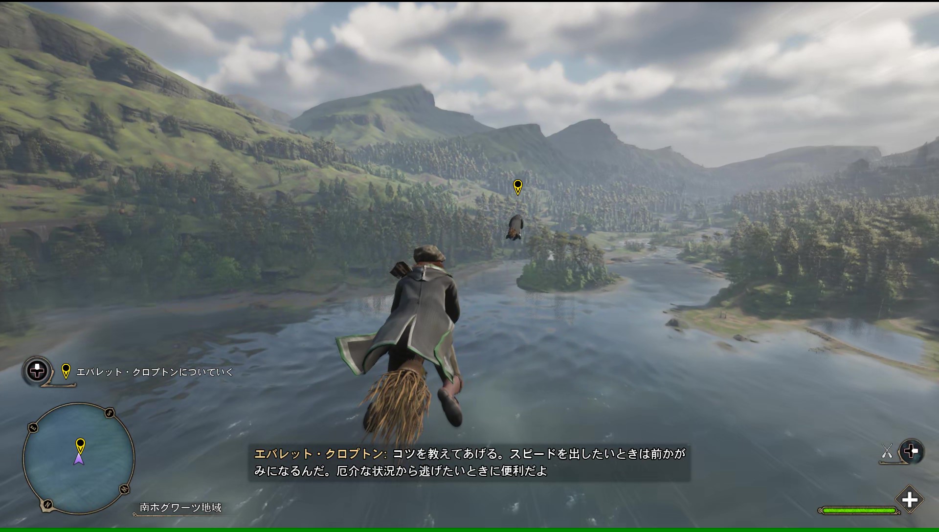 ムービー後、エバレットについていきながら箒移動を楽しもう。